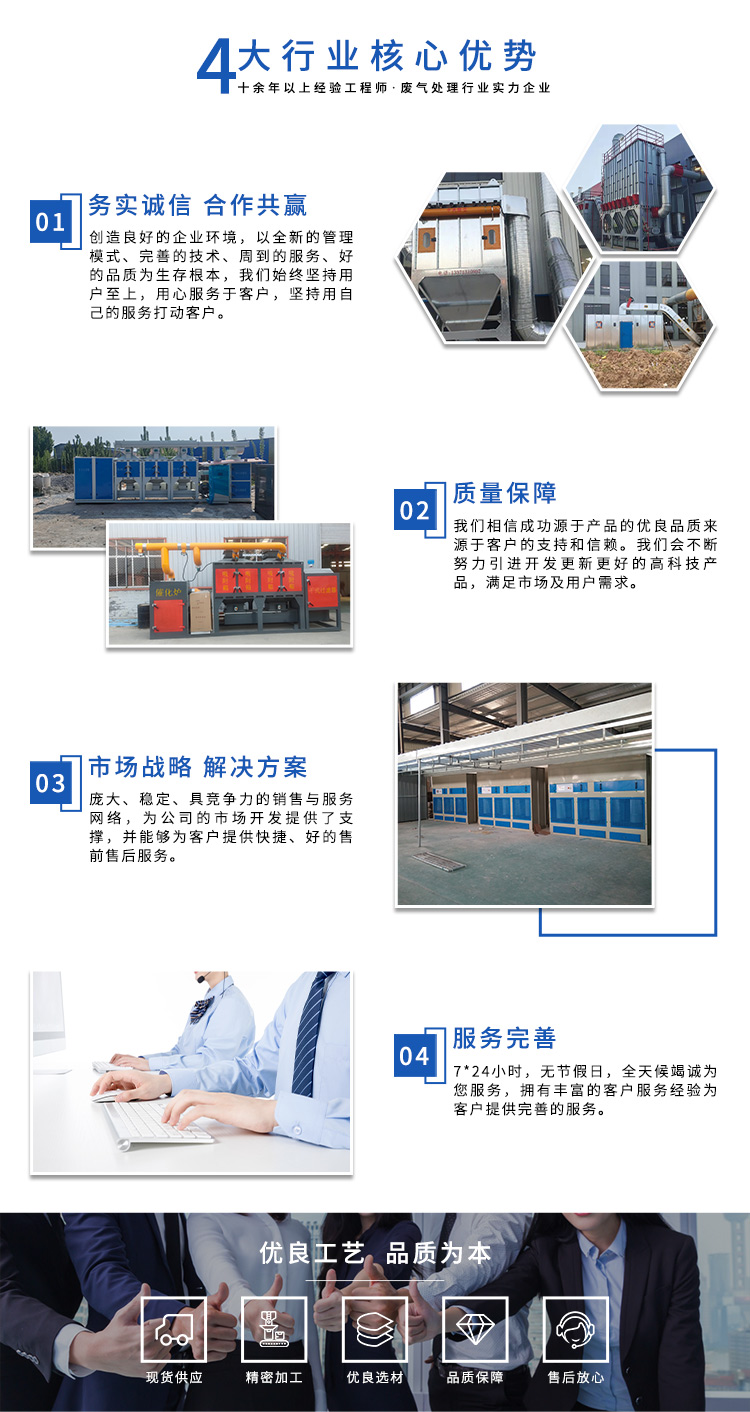 公司自成立以來,始終專注于工業廢氣、污水、粉塵等環境污染的治理,先后研發出催化燃燒設備、光氧催化廢氣處理設備、低溫等離子廢氣處理設備、粉塵處理-體化設備等一系列環保設備,產品先后通過ISO901質量管理體系認證、中國環境保護產品認證。